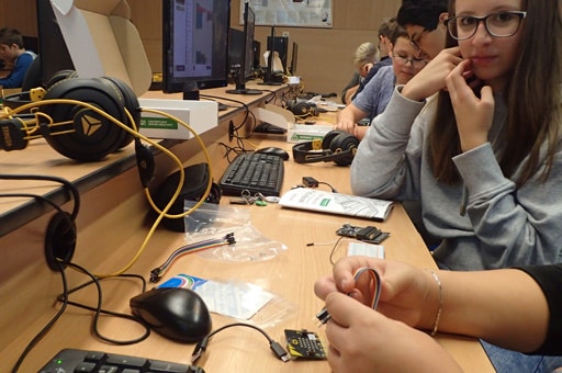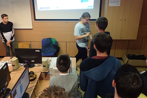 Popis: V loňském školním roce se díky Meet and Code mohli žáci seznámit se základy programování kapesního programovatelného počítače BBC micro:bit. V letošním roce jsme žáky v praktickém kurzu seznámili s dalšími možnostmi, které micro:bit umožňuje, a to jak nastavit komunikaci a posílat informace z jednoho microbitu na další. Protože je microbit vybaven bezdrátovou komunikací s protokolem bluetooth, může kromě posílání příkazů na smart zařízení jako chytré telefony či tablety, komunikovat mezi sebou. Tato takzvaná „peer to peer“ komunikace funguje podobně jako po drátě, tj. jedno zařízení vyšle zprávu na určitém kanálu a všechna zařízení poslouchající na stejném kanálu tuto zprávu přijmou. Žáci si během kurzu naprogramovali micro:bity pro vzájemnou komunikaci a tu pak využili ke hře “Geocaching”. Jednotlivé naprogramované micro:bity se rozmístili po místnosti a následně je s pomocí dalšího micro:bitu hledali.